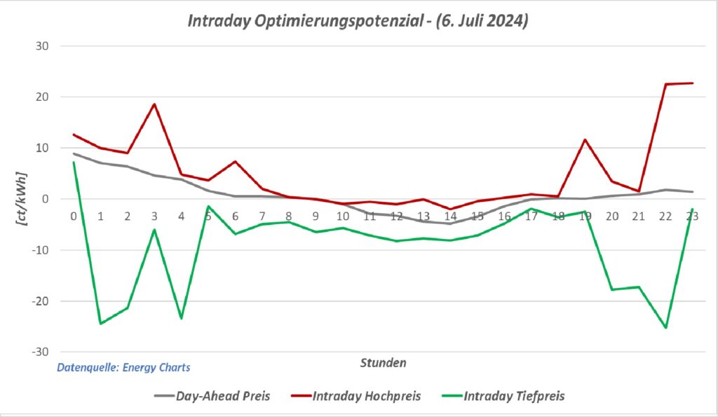 Die Preiskurven des Intradaymarktes (erzielte Höchst- und Tiefstpreise der Transaktionen im Tagesverlauf) im Vergleich zur Preiskurve des Day-Ahead-Marktes (von der Börse festgelegte Stundenpreise) zeigt, dass im Intradaymarkt Strom oft noch günstiger eingekauft werden kann