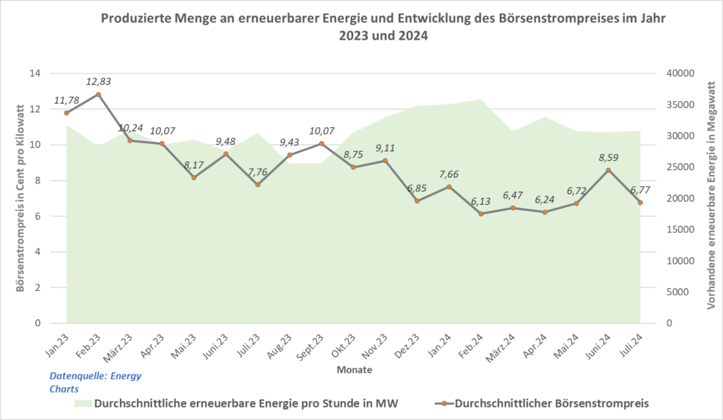 Im Juli kostete Strom an der Börse durchschnittlich 6,73 ct/kWh; rekordverdächtige 81 Stunden lag der Strompreis an der Börse unter null