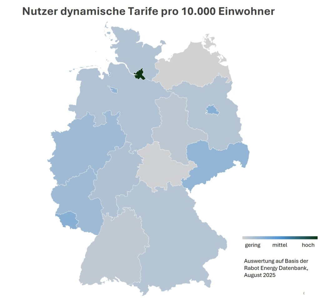 Ein weiterer Wendepunkt für die Entwicklung flexibler Tarife ist die flächendeckende Einführung von Smart Metern. Seit Januar 2025 wächst der Markt rasant: Bei Rabot Energy stieg der Anteil der Kunden mit Smart Meter in den ersten sechs Monaten um monatlich 10,6 %. Besonders in Regionen wie Hamburg und Sachsen ist die Verbreitung von Smart Metern hoch – ein Indiz für die Bereitschaft der Verbraucher, durch moderne Technik ihren Stromverbrauch gezielt zu steuern.