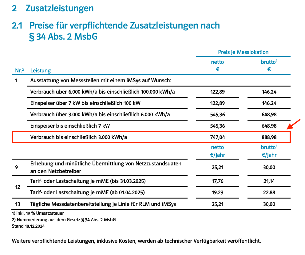 - Vorzeitiger Einbau eines intelligenten Messsystems: einmalig 100 Euro (Die Kosten wurden im Februar 2025 aufgrund eines neuen Gesetzes von 30 auf 100 erhöht.)