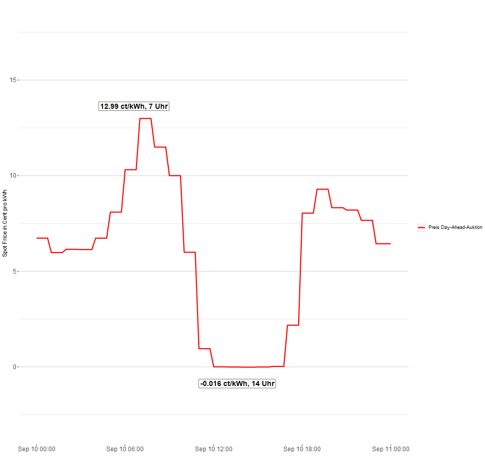 Die Strompreise an der Börse schwanken (Grafik rechts). Am 10. September 2024 beispielsweise von 12,99 Cent pro Kilowattstunde bis minus 0,016 Cent pro Kilowattstunde. Dynamische Stromtarife geben diese Preisschwankungen an Verbraucher weiter, sodass diese von Niedrigpreisphasen und negativen Strompreisen profitieren können.