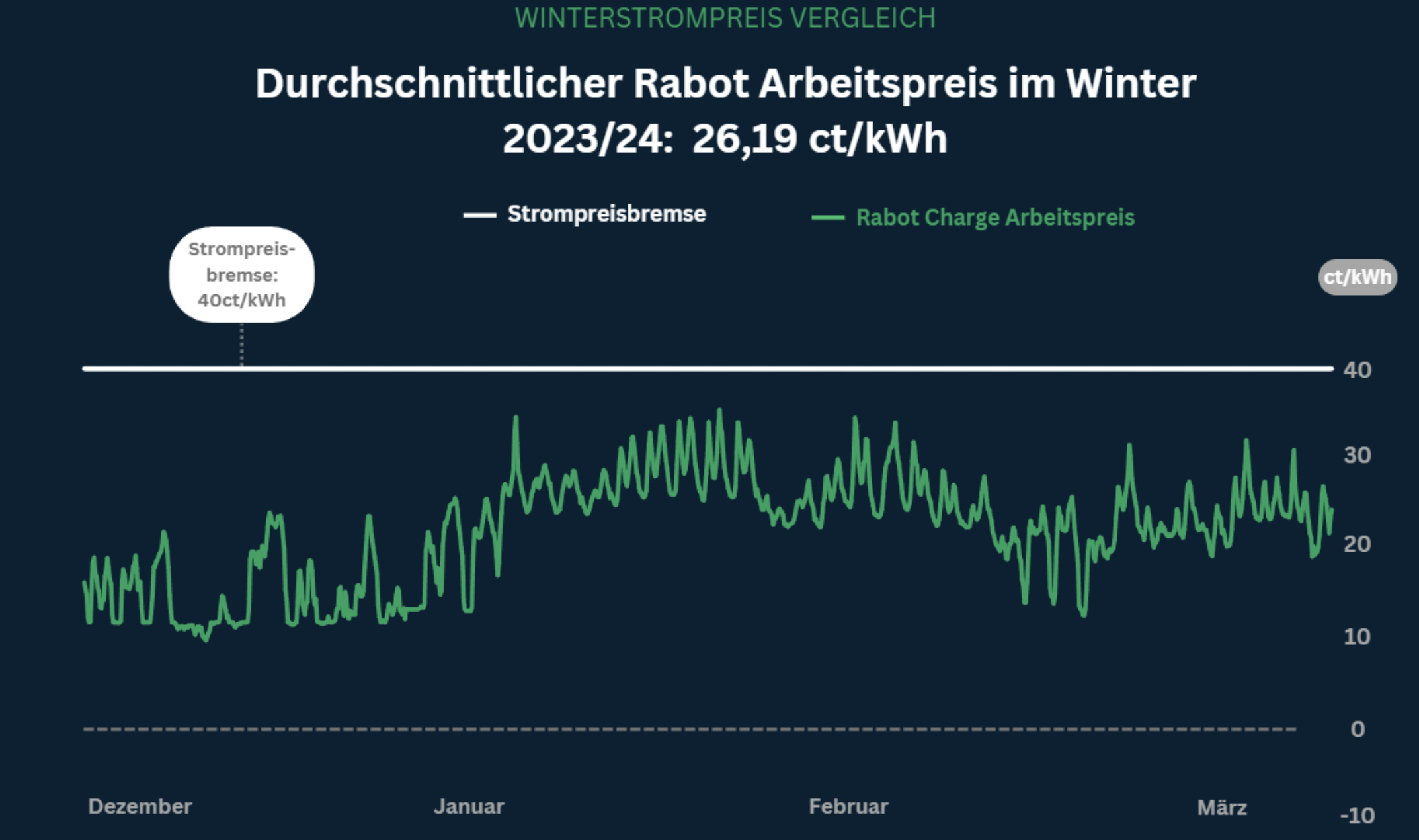 Auch vor steigenden Winterstompreisen müssen Rabot Energy Kunden keine Angst haben. Im Winter 2023/24 hat sich die Situation deutlich entspannt. Hier lag der durchschnittliche Arbeitspreis für Rabot Energy Kunden bei 26,19 Cent/kWh.