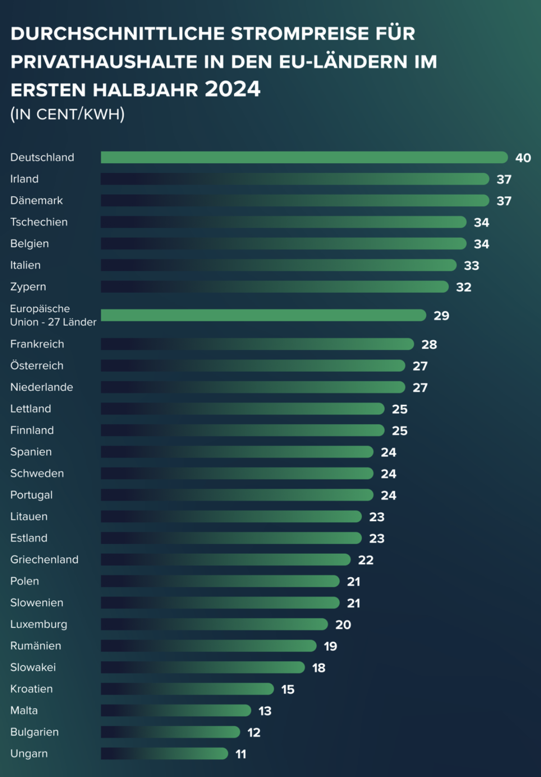 Deutschland wies im ersten Halbjahr 2024 die höchsten Strompreise in Europa auf. So lag der Preis pro Kilowattstunde in Deutschland im genannten Zeitraum bei 40 ct/kWh, während der Durchschnitt aller 27 EU-Länder bei nur 29 ct/kWh lag. Die günstigsten Strompreise gab es in Ungarn mit nur 11 ct/kWh.