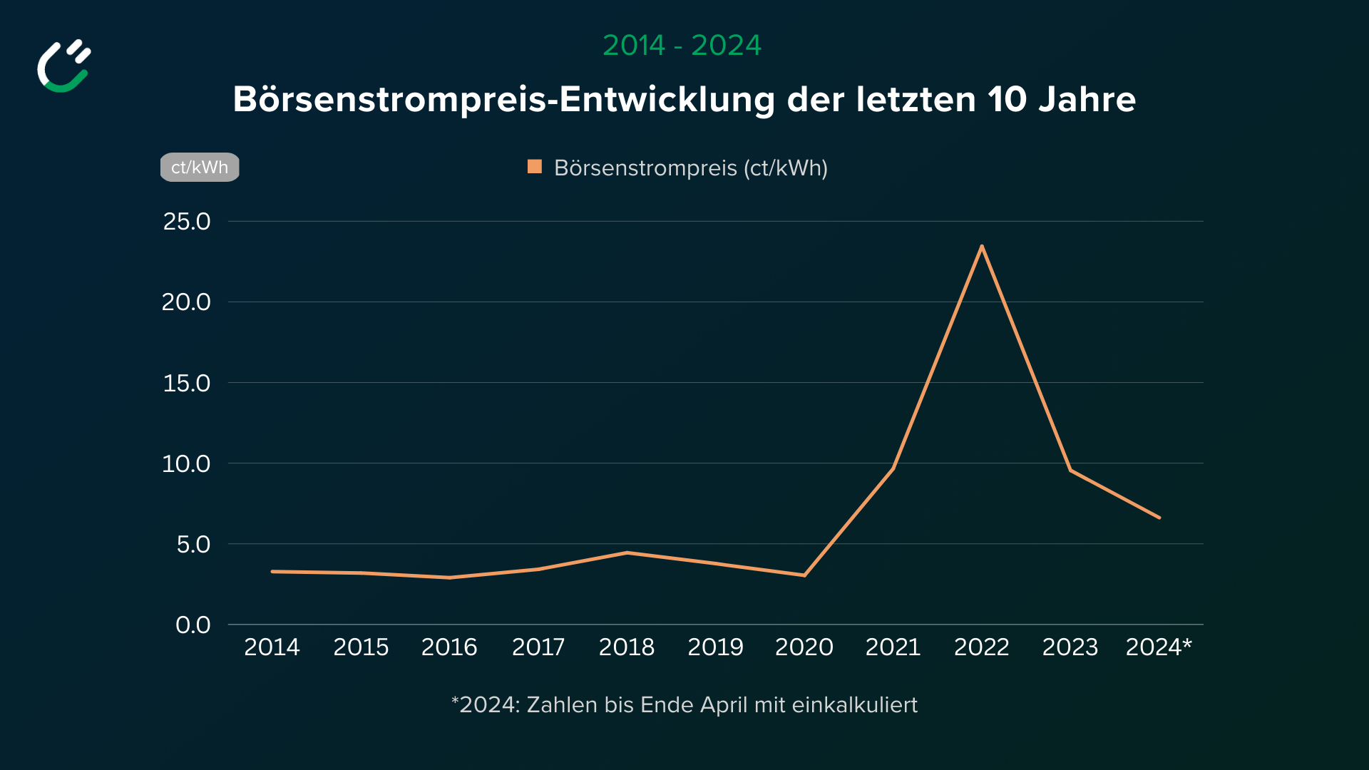 Zwischen 2021 und 2022 sind die Börsenstrompreise in Deutschland auf ein Rekordhoch gestiegen, lagen sie an der Börse im Jahr 2020 noch unter 5 ct/kWh, stiegen sie in 2021 auf etwa 10 ct/kWh und im Jahr 2022 auf 23,55 ct/kWh. Begründet ist dieser historische Anstieg einerseits im Krieg zwischen Russland und der Ukraine und andererseits in den hohen Rohstoffpreisen, ausgelöst durch die Pandemie.